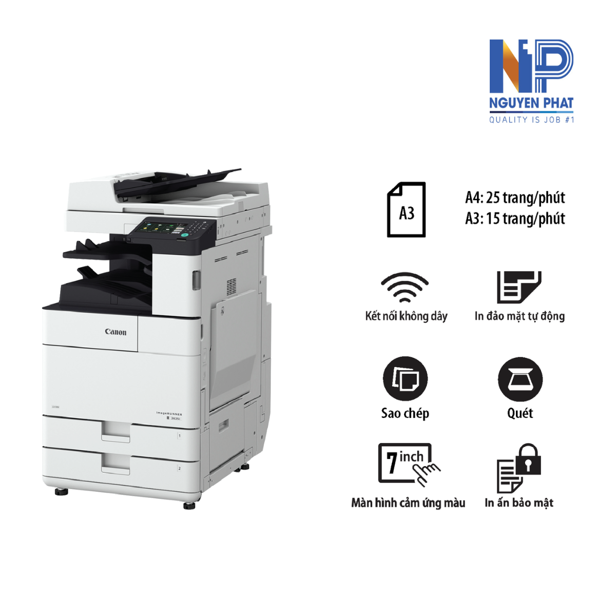 Khi đầu tư Canon imageRUNNER 2625i tại Mực in Nguyên Phát, khách hàng không chỉ nhận một thiết bị in ấn, mà còn được đảm bảo về quy trình kỹ thuật, hậu mãi và kiểm soát chi phí vận hành lâu dài. Dưới đây là các quyền lợi cụ thể: